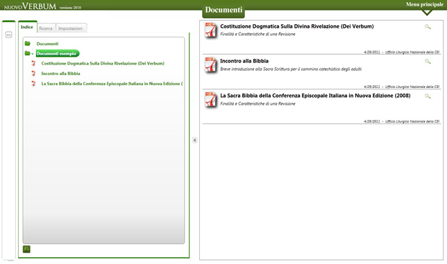 Dal Vostro Nuovo Verbum, una volta effettuato l’aggiornamento, potete accedere al modulo DOCUMENTI direttamente dalla Home Page oppure dal menù interno presente negli altri moduli. La pagina di apertura presenta già una categoria di Documenti di Esempio e se selezionata con il mouse comparirà sulla destra l’elenco dei documenti presenti nella cartella. Per ogni documento viene riportato il titolo, un sottotitolo, l’autore e la data di pubblicazione. La lente permette di visualizzare l’immagine di copertina.