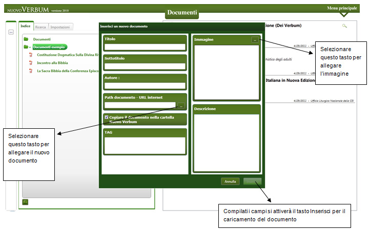 Se si decide di inserire un nuovo documento comparirà la seguente schermata. Per ogni documento si potrà compilare il campo Titolo, Sottotitolo, Autore, inserire TAG (o parole chiave che saranno utili per la ricerca, come vedremo in seguito), una descrizione e un’immagine di copertina